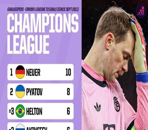 2011年至今欧冠门将失误丢球榜:诺伊尔10次居首,奥纳纳在列